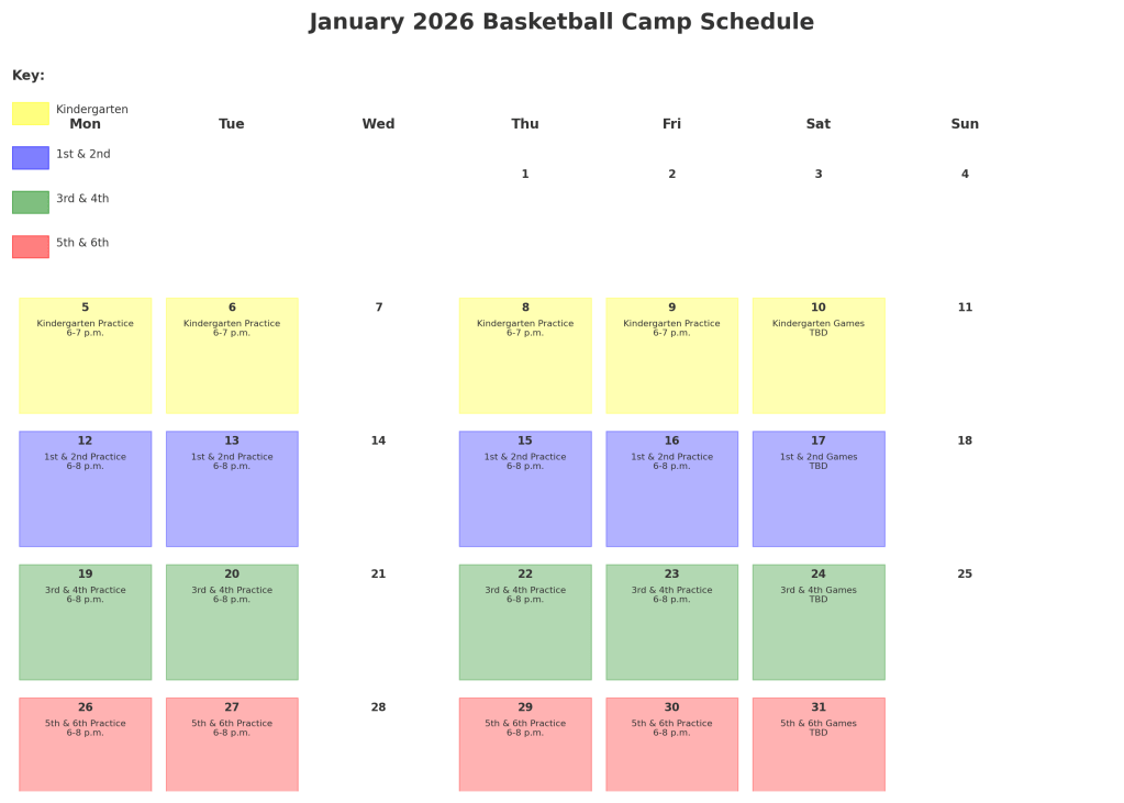 Kindergarten practices are held from 6-7p.m. on January 5th, 6th, 8th, and 9th, with games on January 10th (TBD). 1st & 2nd Grade practice from 6-8 p.m. on January 12th, 13th, 15th, 16th, with games on January 17th (TBD). 3rd and 4th Grade practice from 6-8p.m. on January 19th, 20th, 22nd, and 23rd, with games on January 24th (TDB). 5th and 6th Grade practice from 6-8p.m. on January 26th, 27th, 29th, and 30th, with games on January 31st (TBD).